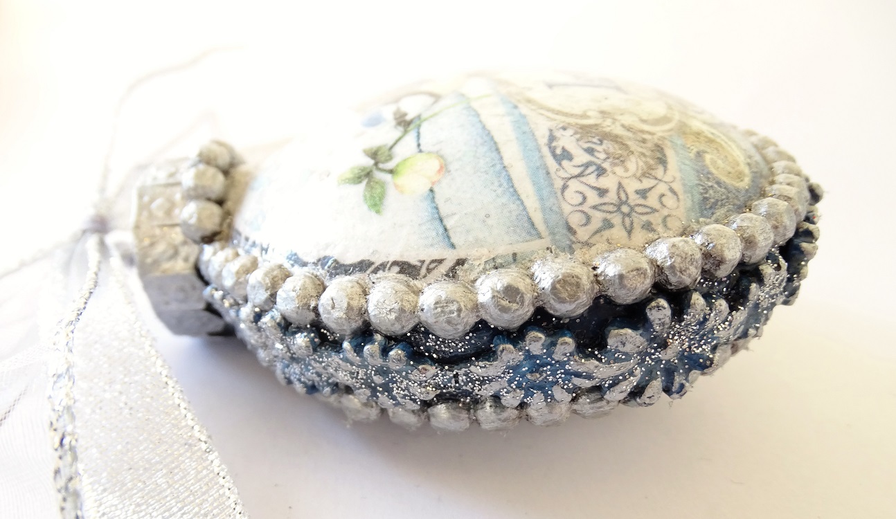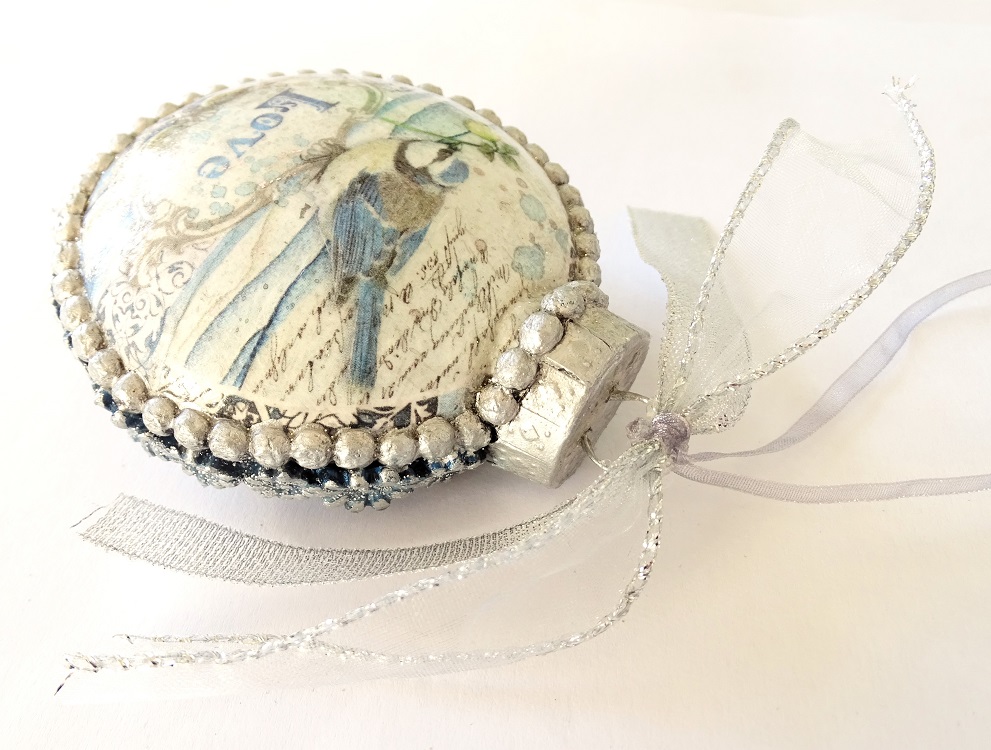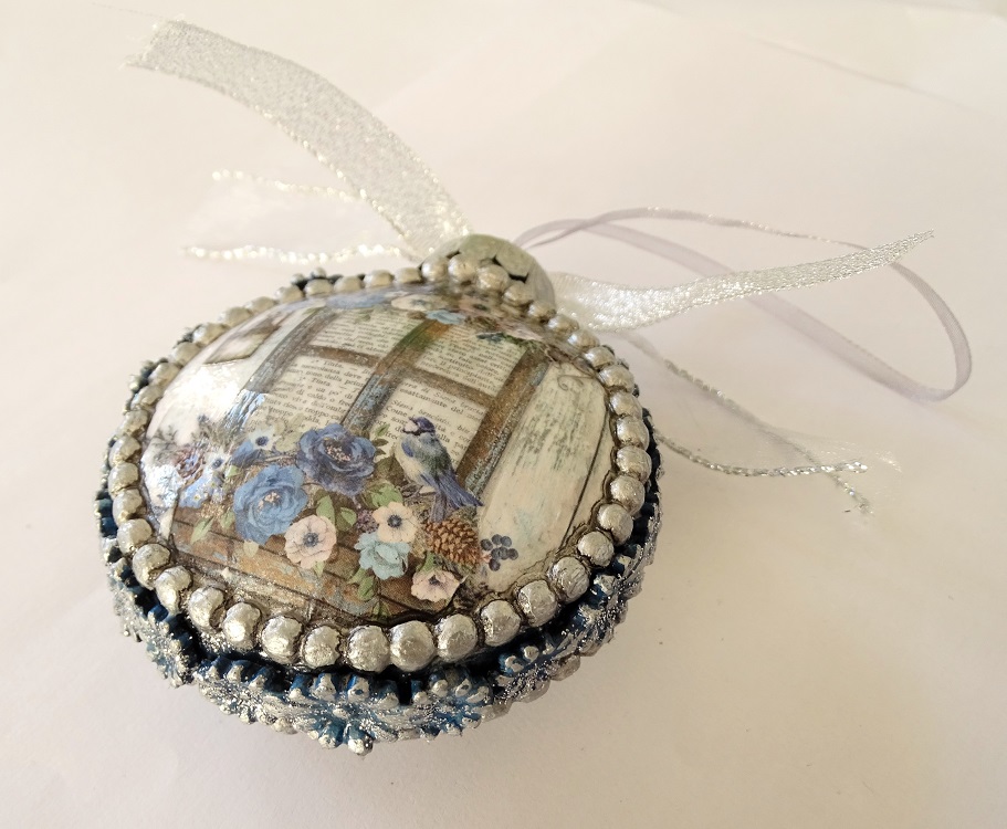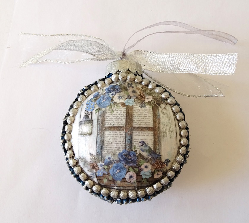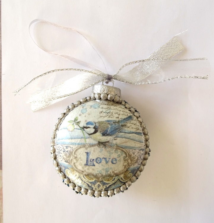 Een handgemaakte kerstbal met een afbeelding van een pimpelmees met bloemetje in de snavel