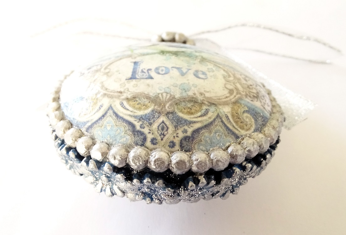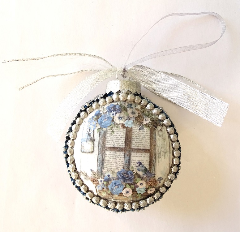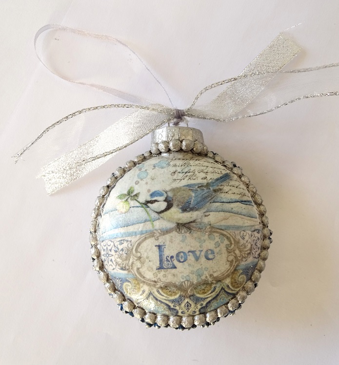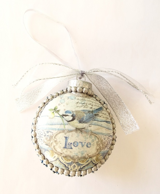 Dit is een prachtige handgemaakte kerstbal ‘Love’. Op een kant van de kerstbal staat een afbeelding van een pimpelmees met bloemetje in de snavel. Op de andere kant een vensterbank met blauwe en witte bloemen met een klein pimpelmees vogeltje.