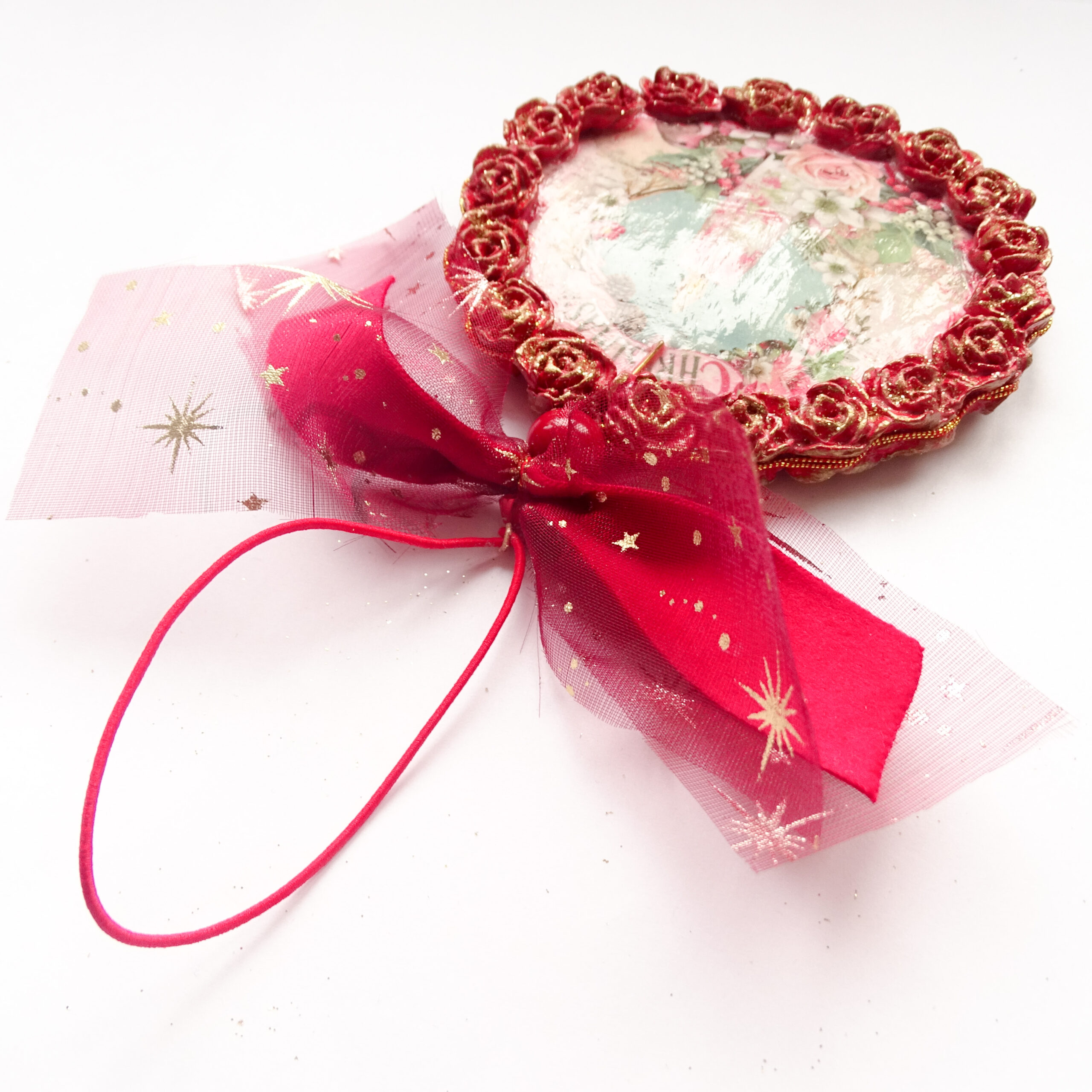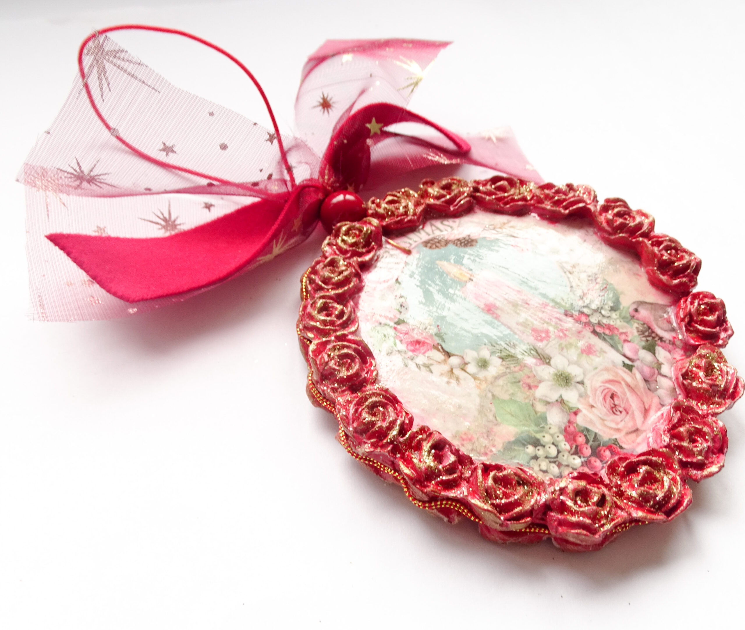 Een handgemaakte kersthanger met een afbeelding van een kaars met roodborstje en bloemen. Om de afbeeldingen heen zit een rand van roosjes met glitter.