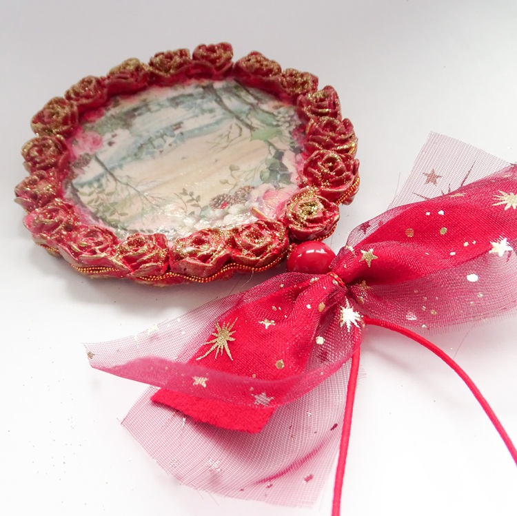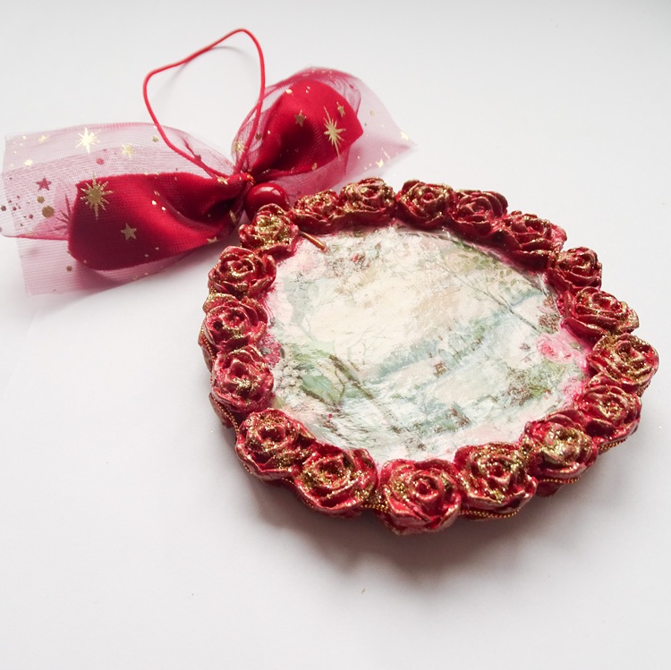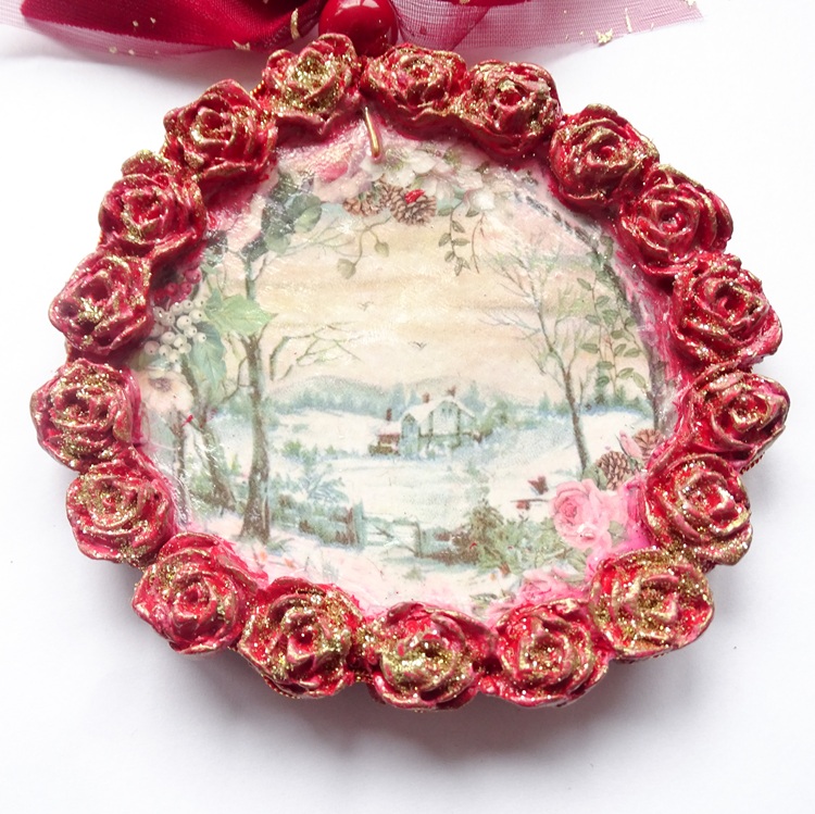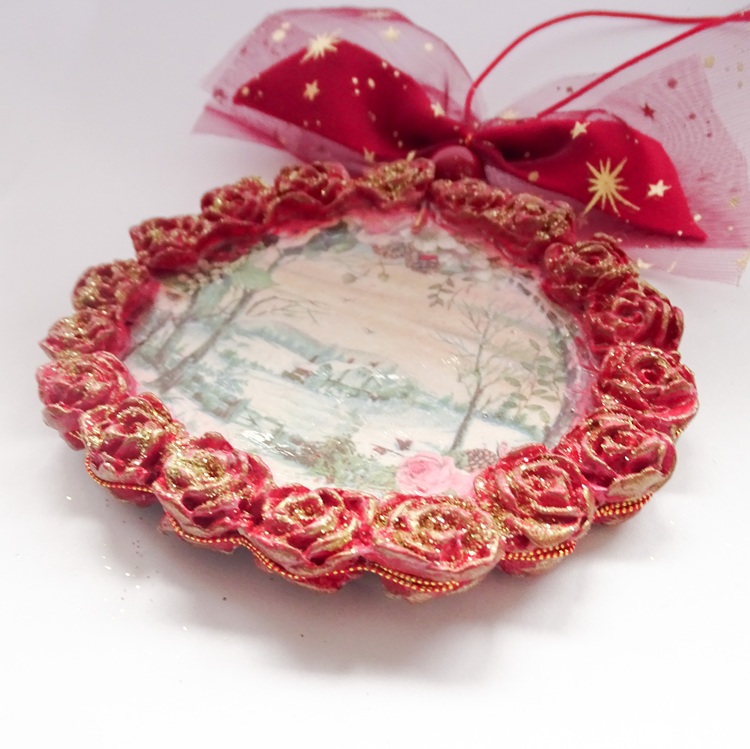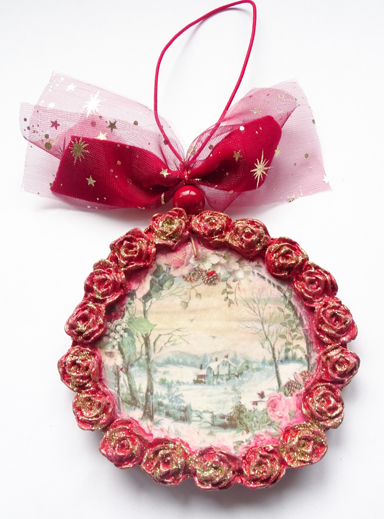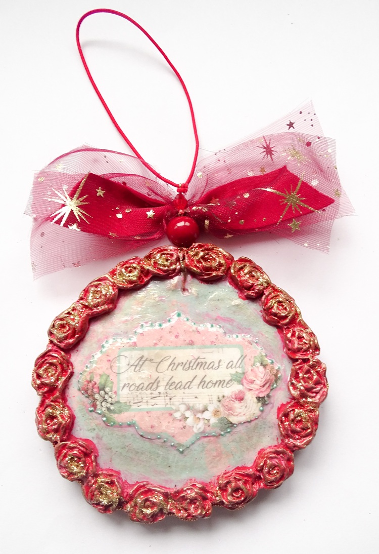 Dit is een prachtige handgemaakte kersthanger met een winters landschap met uitzicht op een klein dorpje. Aan de andere kant zit een afbeelding met de tekst: “At christmas all roads lead home”. Om de afbeeldingen heen zit een rand van rood/roze roosjes met glitter. Boven de hanger zit een rode kraal en rood/gouden strik.
